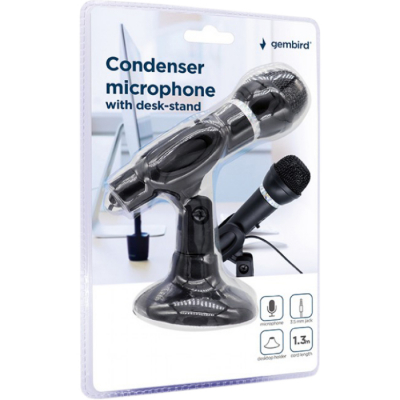 Микрофон Gembird MIC-D-04 Black (MIC-D-04) конденсаторный, Назначение - для компьютеров, всенаправленный (360°), 3.5 мм mini-jack, - 58 дБ ± 3 дБ, 20 - 20000 Гц, 10000 Ом, 1,3 м, 130 х 110 х 75 мм, 90 г, черный