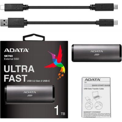 Накопитель SSD USB 3.2 512GB ADATA (ASE760-512GU32G2-CTI) 512 GB, 3D TLC, portable, USB 3.2 Type-C, Скорость чтения - 1000 Mb/s, Скорость записи - 800 Mb/s, 122.2 х 44 х 14 мм, 95 г, темно-серый