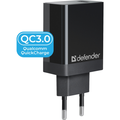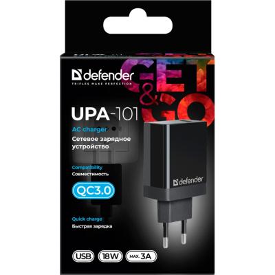 Зарядное устройство Defender UPA-101 black, 1 USB, QC 3.0, 18W (83573) Тип - адаптер, Питание - сеть, Назначение - универсальное, тип выходного подключения - USB, Max - 3 А, 18 Вт, количество USB портов - 1 x USB, быстрая зарядка - Quick Charge 3.0, черный