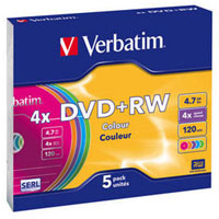 Диск DVD Verbatim 4.7Gb 4x SlimCase 5шт Color (43297) Вид - DVD+RW, ёмкость - 4.7 Гб, скорость - 4x, количество в упаковке - 5 шт