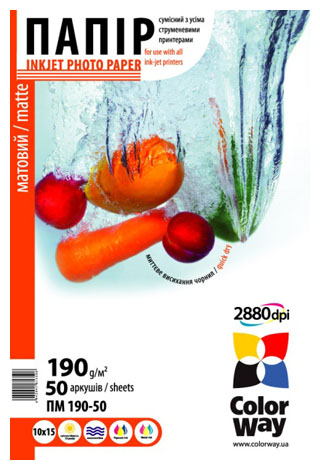 Фотобумага ColorWay A4 190г Matte 50ст. (PM190050A4) тип печати - струйный, цвет - белый, формат - А4 (297 x 210 мм), плотность - 190 г/м2, покрытие - матовая, количество - 50