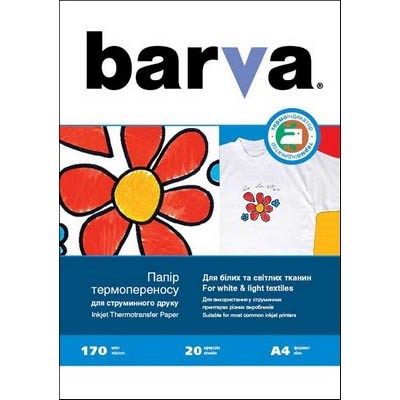 Бумага Barva A4 THERMOTRANSFER White (IP-T200-074) тип печати - струйный, цвет - белый, плотность - 170 г/м2, покрытие - без покрытия, Особенности - термотрансфер, количество - 20