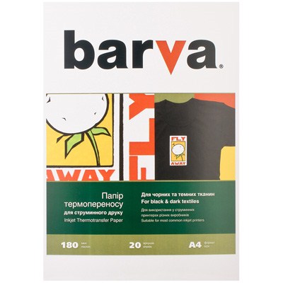 Бумага Barva A4 THERMOTRANSFER Black (IP-T205-075) тип печати - струйный, цвет - белый, плотность - 180 г/м2, покрытие - матовая, Особенности - термотрансфер, количество - 20