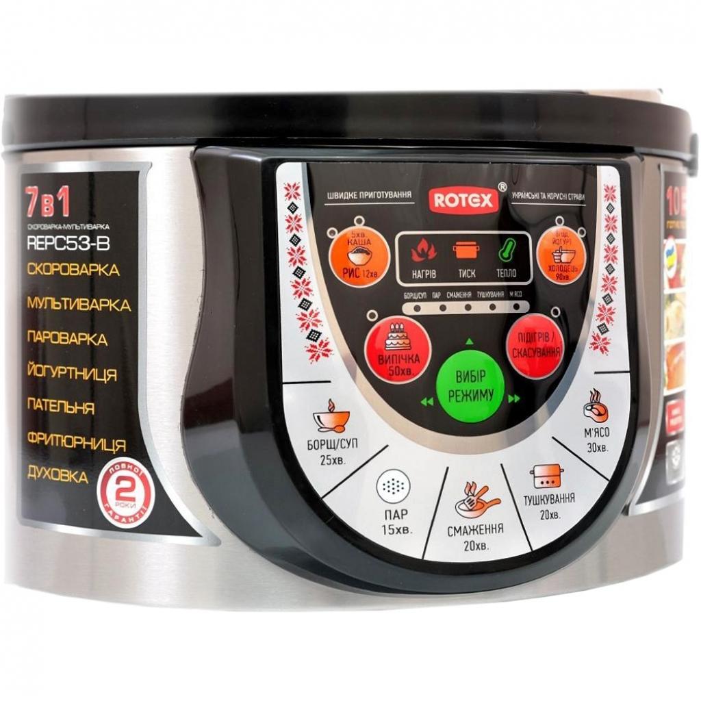 | | Мультиварка Rotex REPC53-B мультиварка - скороварка, Тип нагрева - ТЭН-нагрев, 900 Вт, объем чаши - 5 л, тип внутреннего покрытия - антипригарное, дисплей - есть, количество программ - 10, Управление - электронное, длина шнура - 1.2 м, габариты - 335 х 310 х 310 мм, вес - 3.5 кг, черный, нержавеющая сталь | |   | |